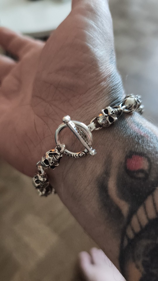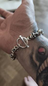 A toggle clasp (bone-bar through ring) secures the bracelet with old-school reliability, while “STERLING” engraving reinforces its true silver pedigree. Whether you’re a biker, a goth, or simply a collector of bold metalwork, this bracelet is more than accessory — it’s an attitude forged in silver.