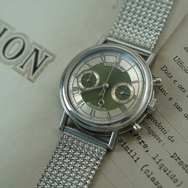 The FARASUTE NL-007S captures the essence of mid-century chronographs while embracing modern engineering. With its Roman numeral dial, sunken subdials, and domed sapphire crystal, it delivers a refined aesthetic reminiscent of 1940s–1950s timepieces — yet powered by a precise and maintenance-free Seiko VK64 quartz chronograph movement.