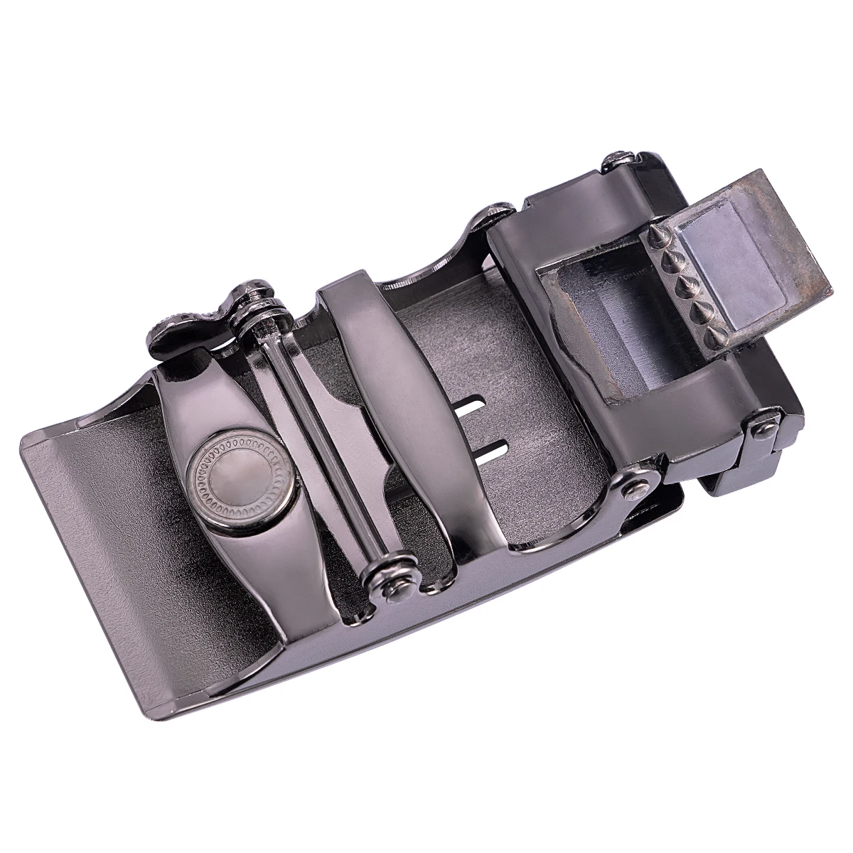 The buckle is made from polished gunmetal alloy with a scratch-resistant brushed texture.