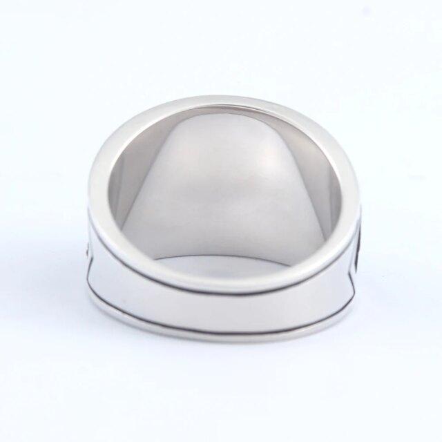 The face of the ring features a framed panel with oxidized black enamel, adding depth and clarity to every engraved detail.