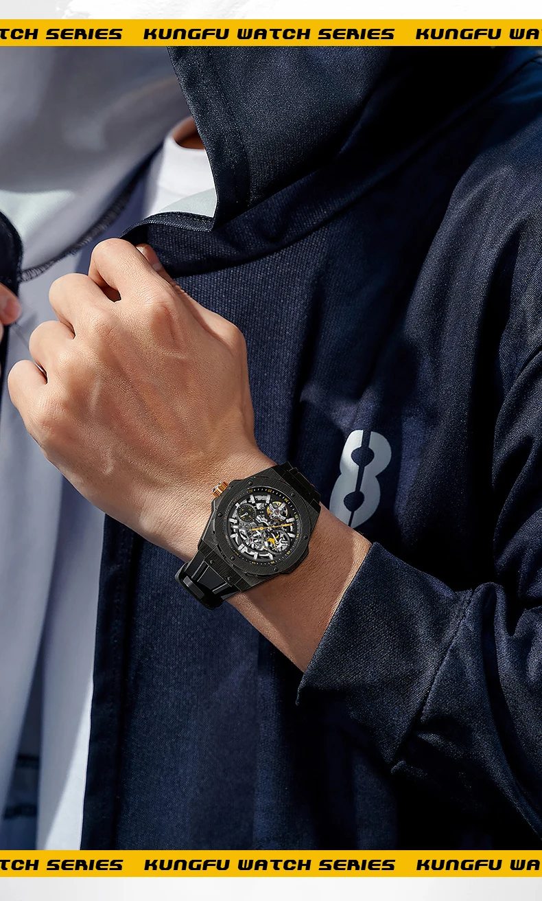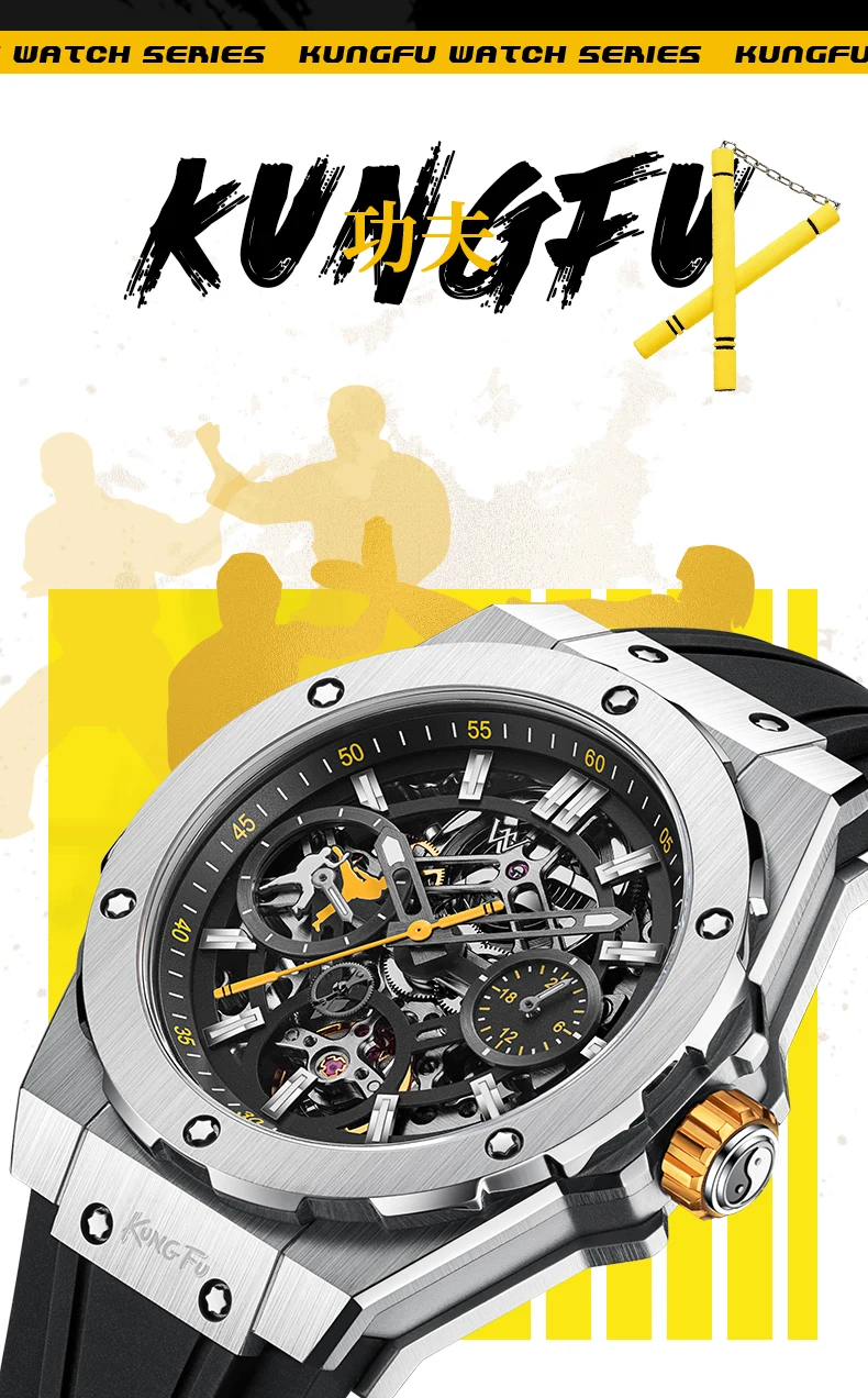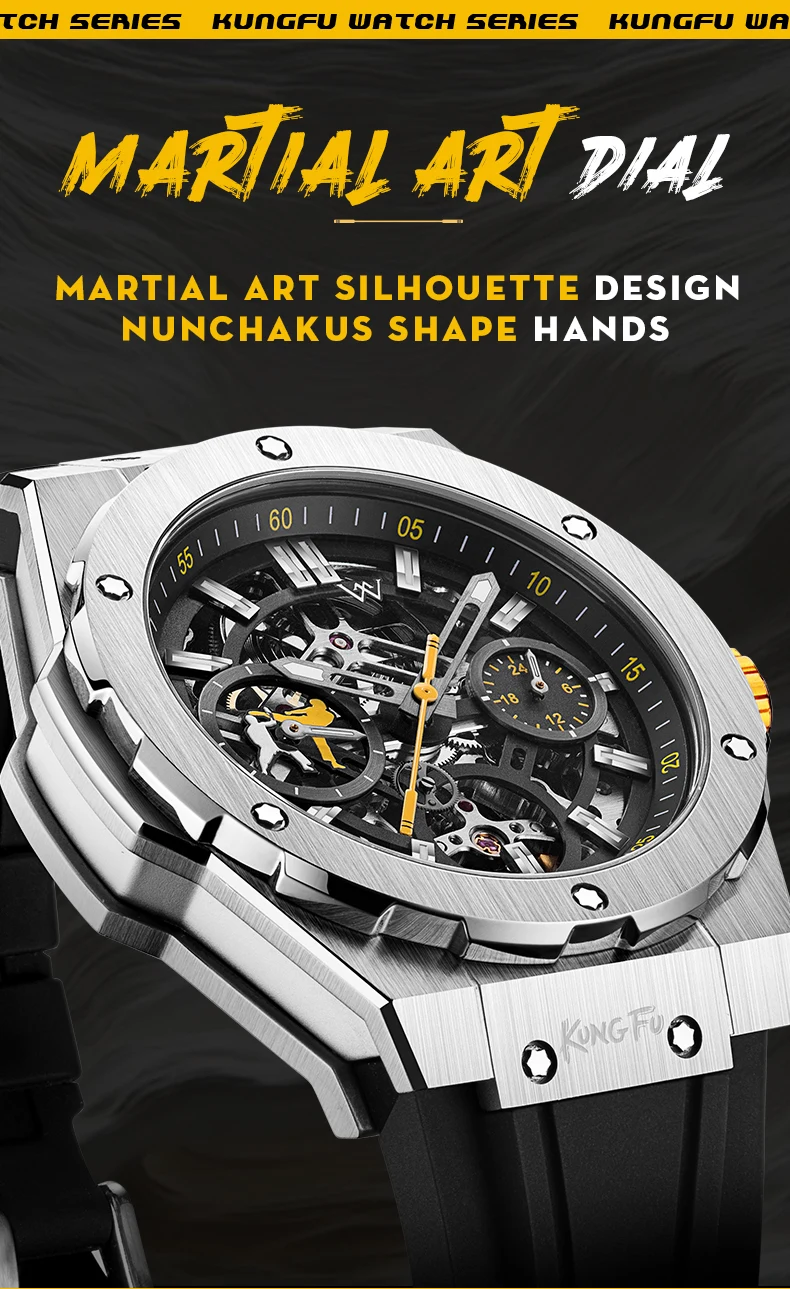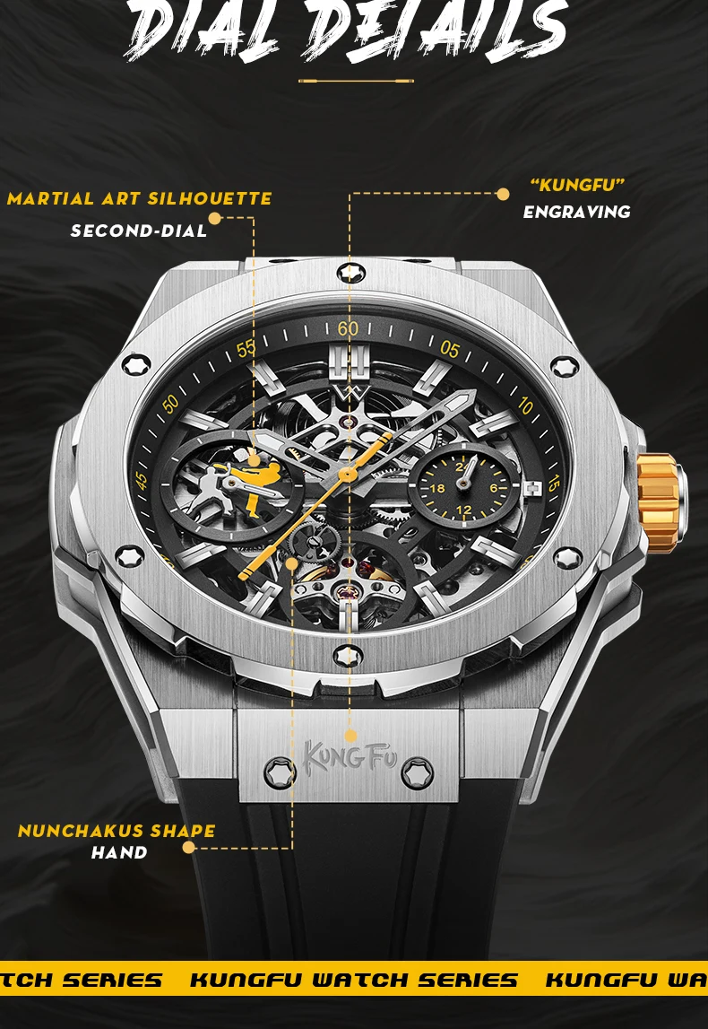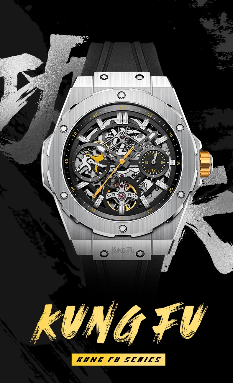 Channeling the rhythm and precision of martial arts, the WM-128M Kung Fu Skeleton Watch is a bold mechanical statement for those who appreciate fluid movement, kinetic art, and powerful symbolism. The skeletonized dial opens a window into the watch’s automatic heartbeat, while design details like the nunchaku-inspired yellow second hand, engraved “Kung Fu” script, and martial artist silhouette transform this timepiece into a wearable tribute to discipline and strength.