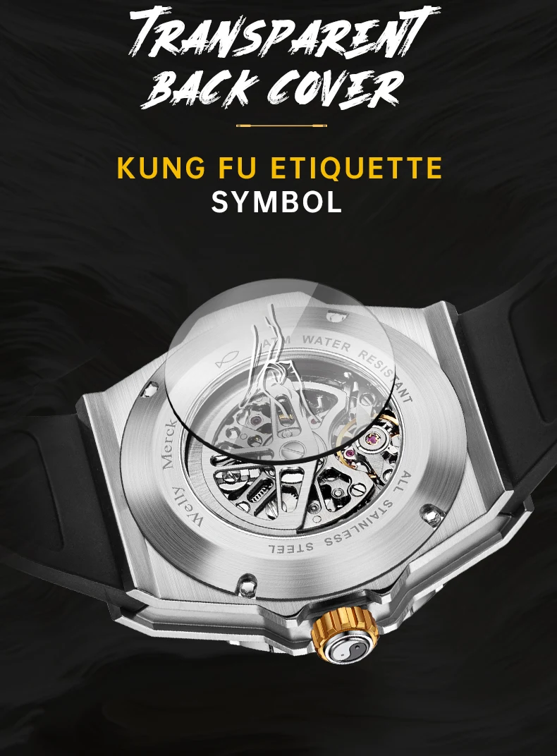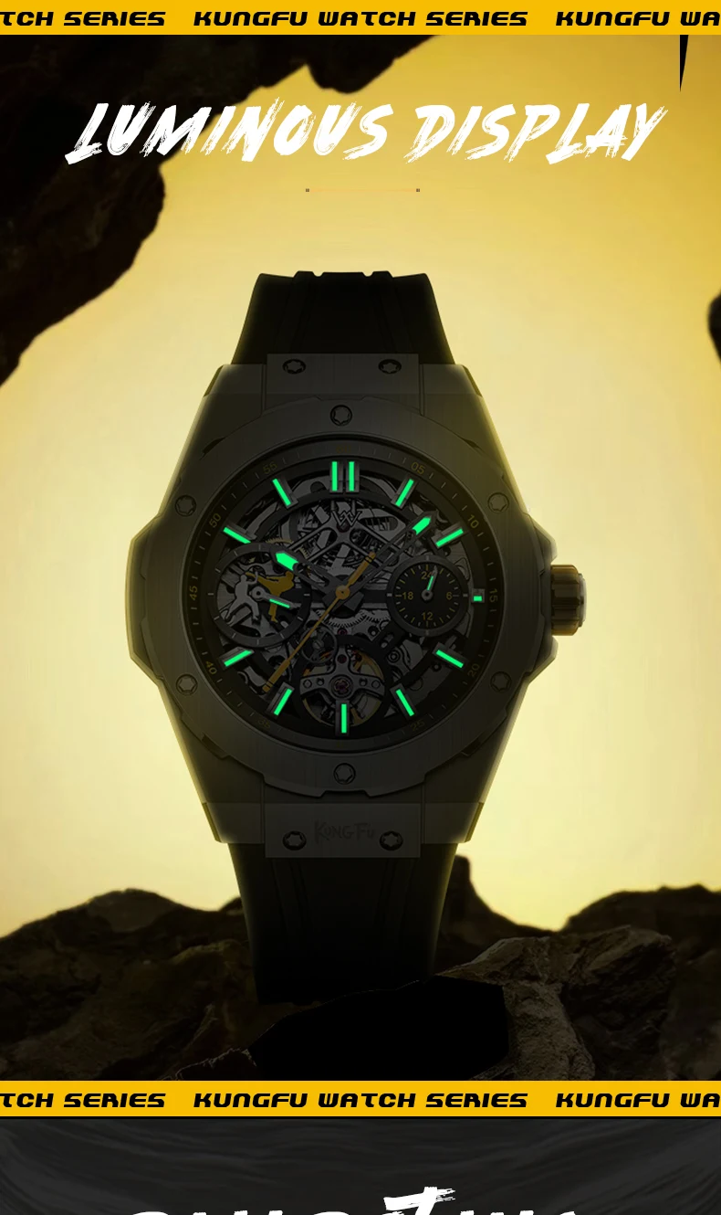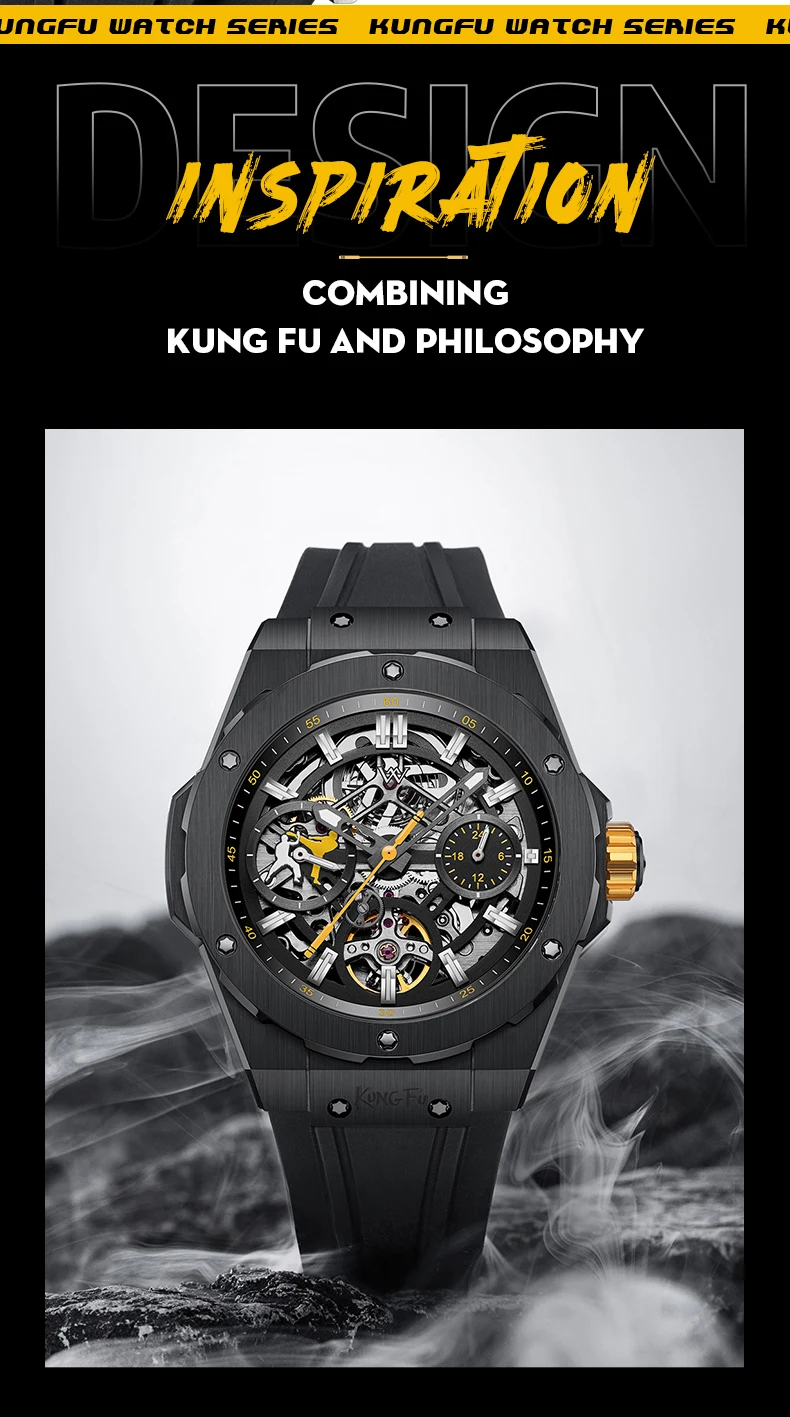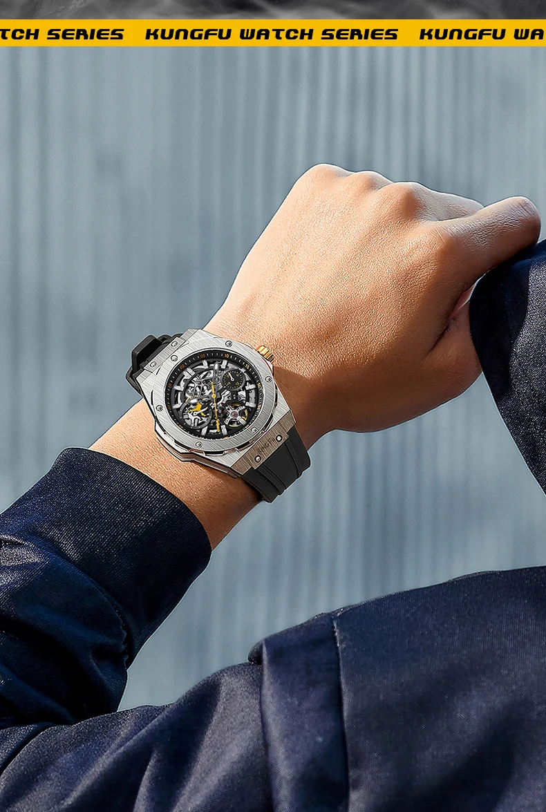 Channeling the rhythm and precision of martial arts, the WM-128M Kung Fu Skeleton Watch is a bold mechanical statement for those who appreciate fluid movement, kinetic art, and powerful symbolism. The skeletonized dial opens a window into the watch’s automatic heartbeat, while design details like the nunchaku-inspired yellow second hand, engraved “Kung Fu” script, and martial artist silhouette transform this timepiece into a wearable tribute to discipline and strength.