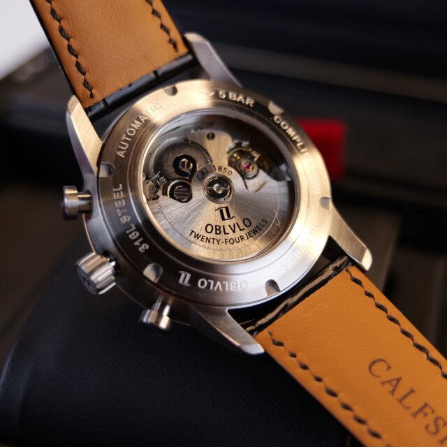 The OBLVLO IM-MUT series embodies precision and style through subtle design choices — domed sapphire glass, luminous markers, and polished pushers. The clean numerals and applied indices enhance legibility, while the exhibition back reveals the beauty of the 21-jewel movement in motion.