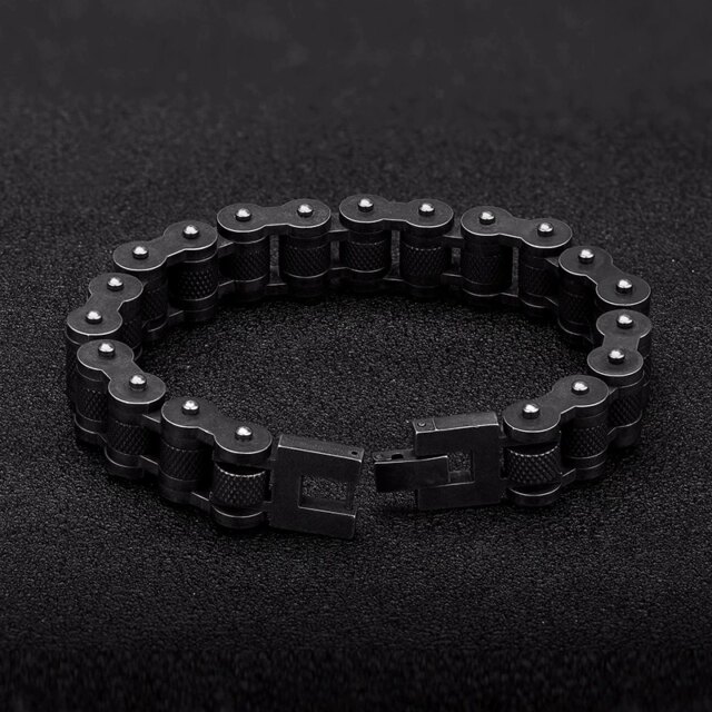 Each link mirrors the structure of a real bike chain — from the knurled rollers to the screw-style pins — creating a mechanical, industrial aesthetic that feels less like jewelry and more like wrist armor. The fold-over clasp locks in securely and sits flush for a clean fit. It’s not stretchy, not subtle, and definitely not for the faint of wrist.