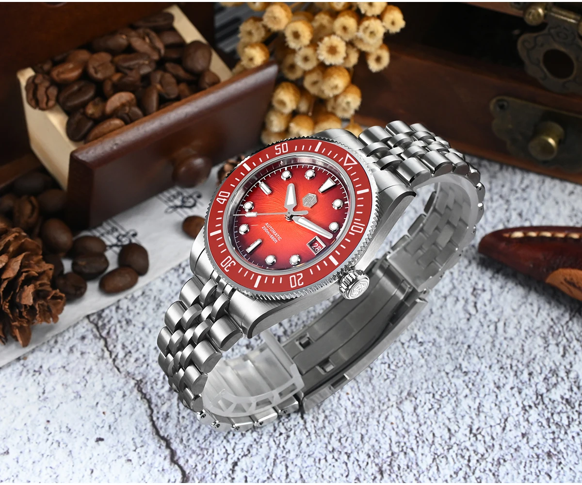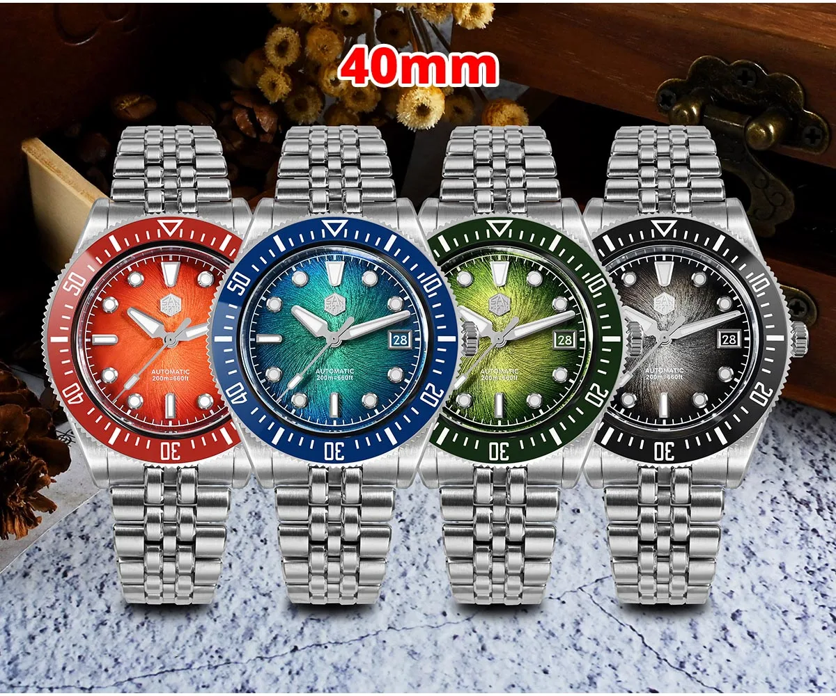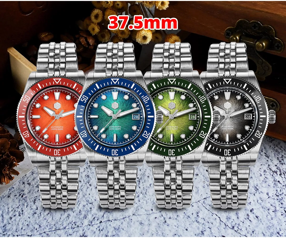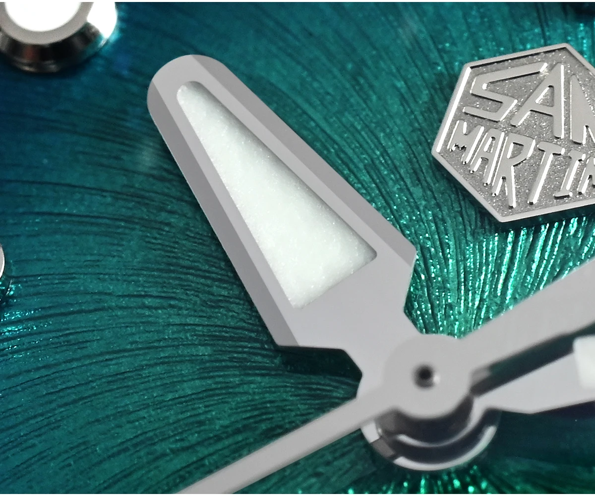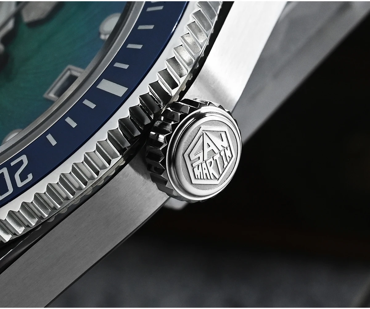 The San Martin SN0148 Diver blends premium materials with a compact, wearable profile available in 37.5mm or 40mm. The highlight is its Enamel Spiral Vortex dial, a textured gradient executed in deep sunburst tones—Blue, Red, Green, and Gray. Combined with the ultra-thin Miyota 9015 automatic movement, the SN0148 offers durability and precision with a refined presence on the wrist.