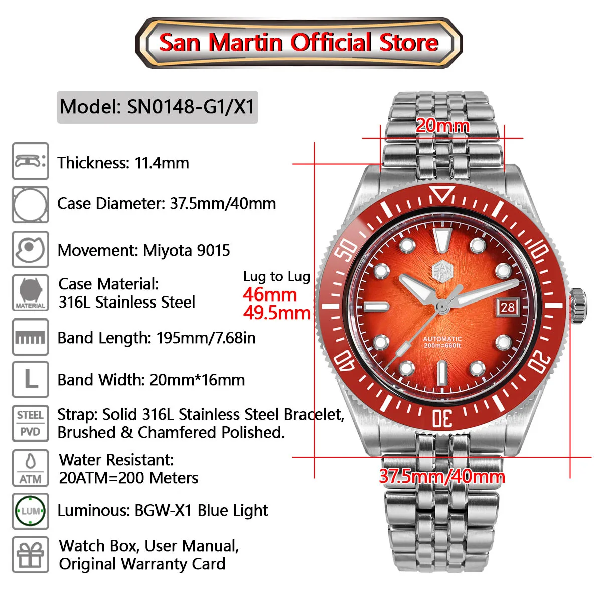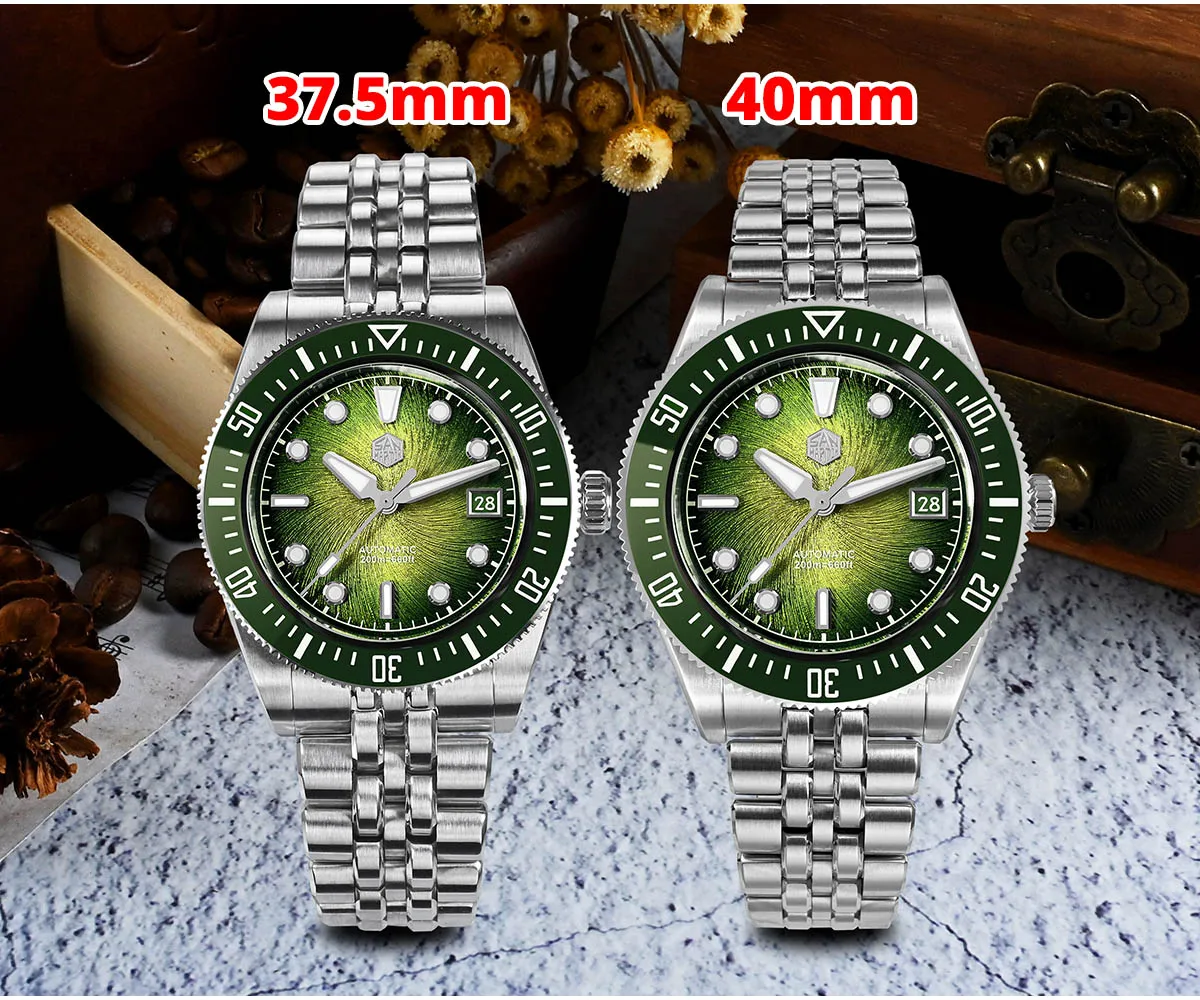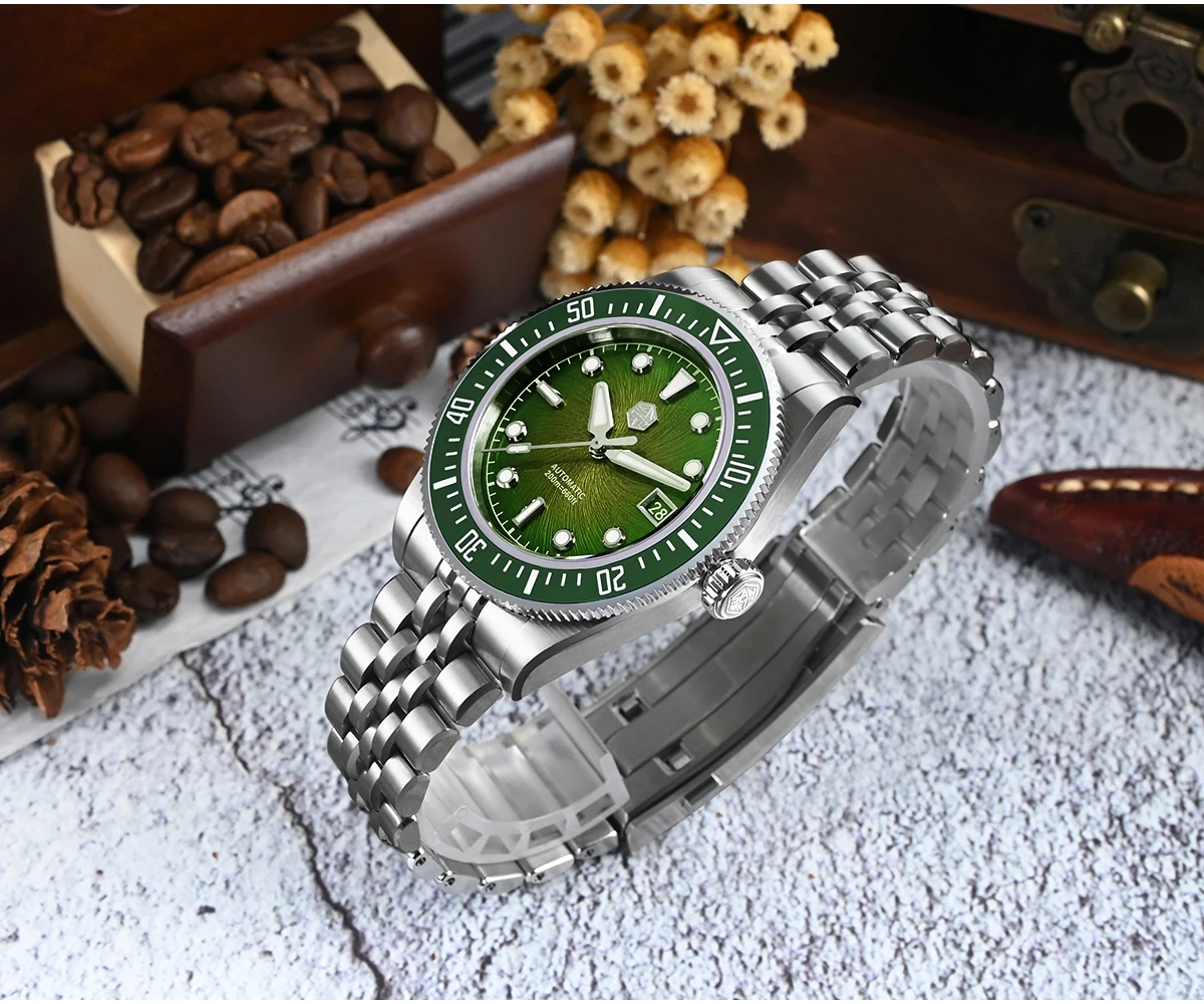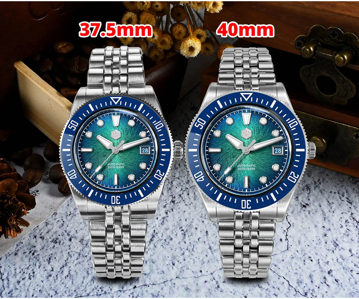 The San Martin SN0148 Diver blends premium materials with a compact, wearable profile available in 37.5mm or 40mm. The highlight is its Enamel Spiral Vortex dial, a textured gradient executed in deep sunburst tones—Blue, Red, Green, and Gray. Combined with the ultra-thin Miyota 9015 automatic movement, the SN0148 offers durability and precision with a refined presence on the wrist.