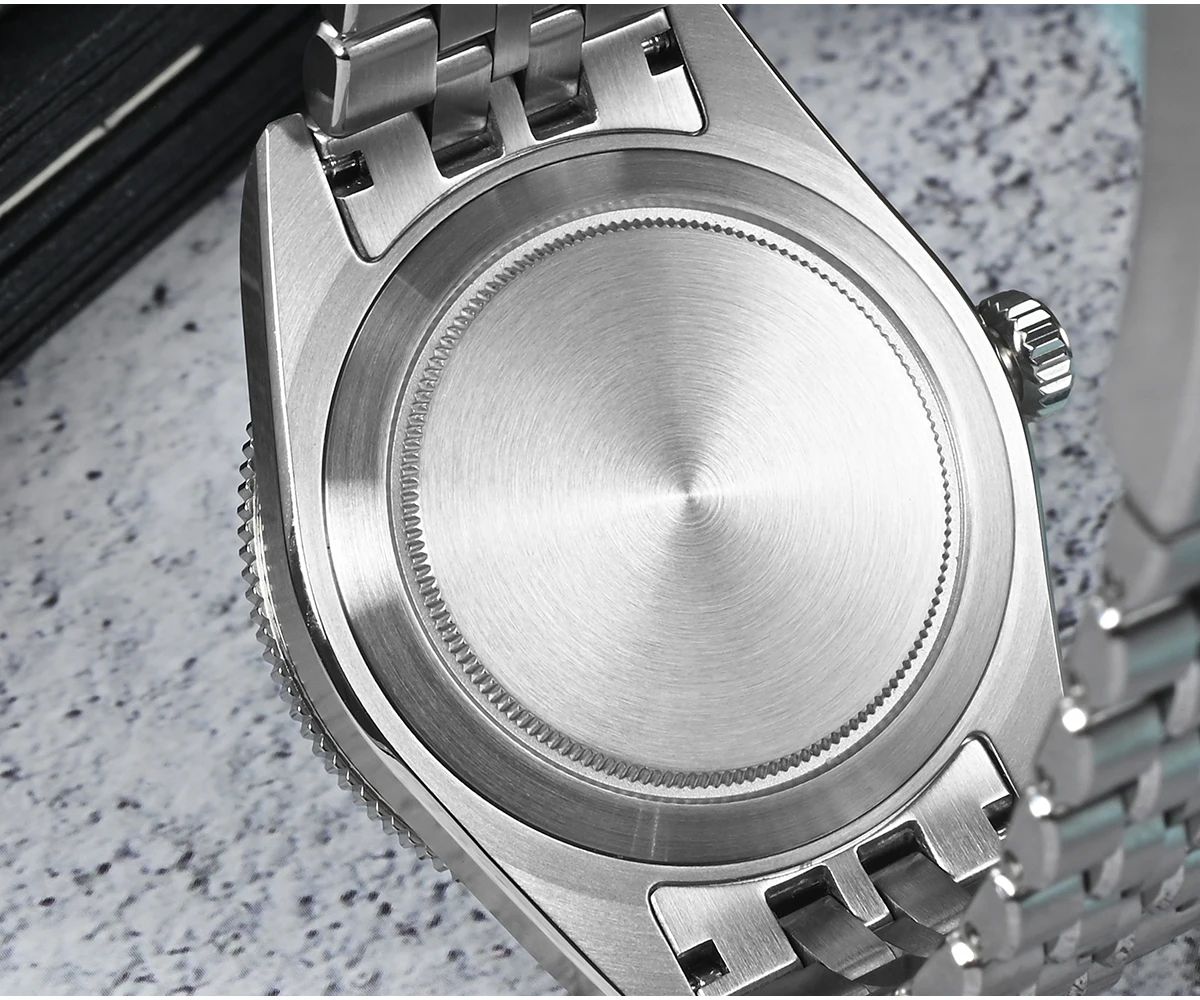 The watch features the Miyota 9015 automatic movement—known for accuracy, thin profile, and reliability.