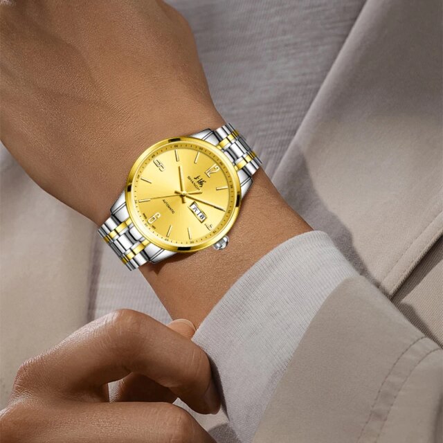 The dial features day and date complications, luminous markers for nighttime visibility, and multiple color options that adapt to different styles. A steel bracelet with a butterfly clasp adds security and elegance, ensuring the watch sits comfortably on the wrist.