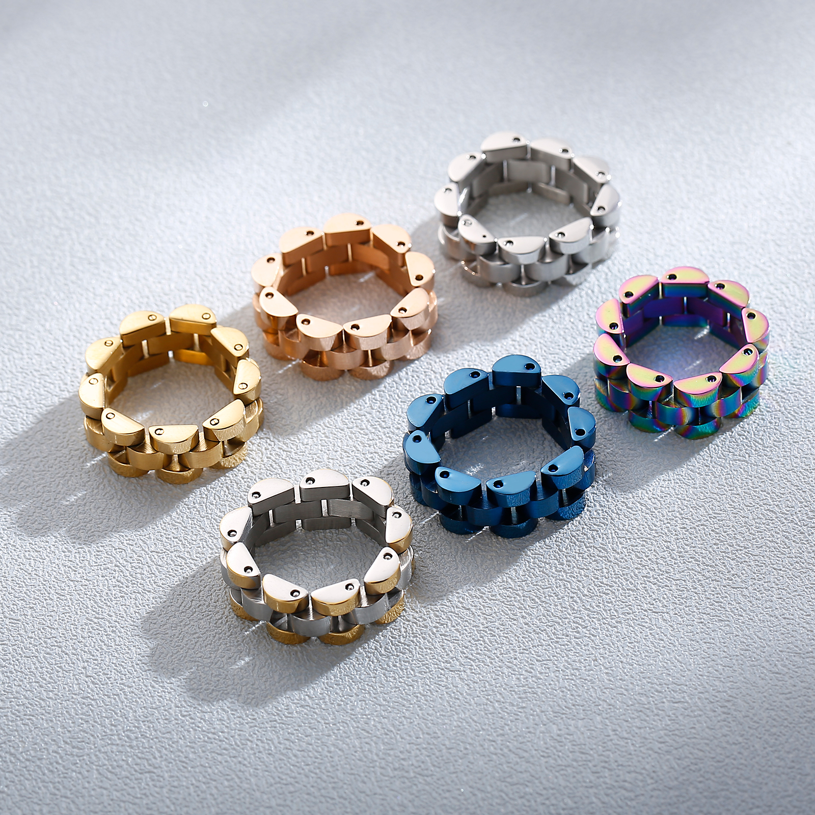 Inspired by the bracelets of luxury watches, each link rotates smoothly and sits comfortably on the finger — creating a look that’s sleek, masculine, and unmistakably modern.
