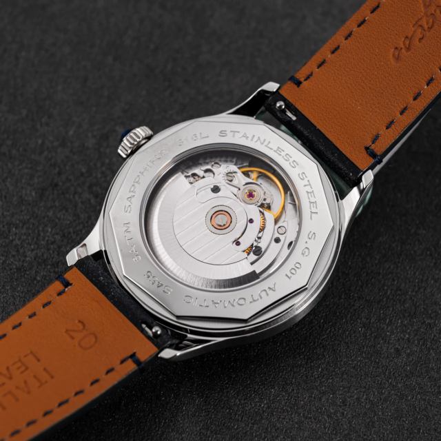 Turn the watch over to reveal the heart within — the ST2130 movement, beating at 28,800 vph with a smooth sweep.