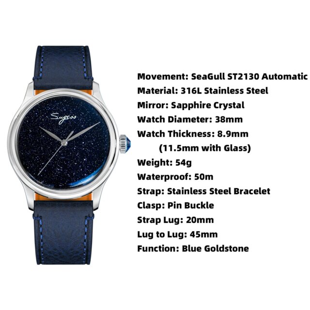The Sugess Blue Goldstone Automatic captures elegance through simplicity — a minimal watch that shines like a midnight sky.